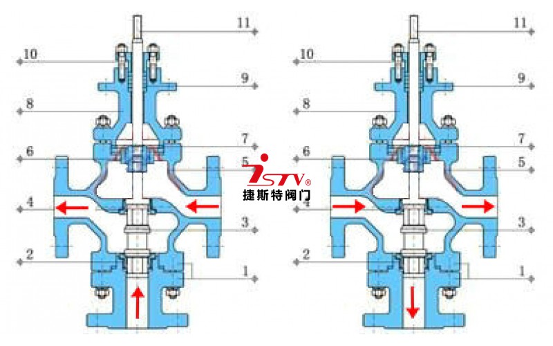 氣動三調(diào)節(jié)閥閥體為三通結(jié)構(gòu),即一進兩出(分流型),兩進一出(合流型),其中三通合流調(diào)節(jié)閥用于將兩種流體混合成第三種流體,或兩種不同溫度的同種流體,混合成同一溫度流體。而三通分流閥則是將一種流體分成兩路流體。